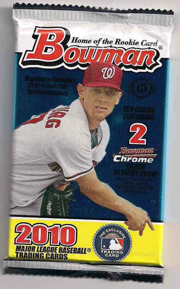 Grabbed my first pack of 2010 Bowman hoping to hit an Austin Jackson auto or settle for a Strasburg or Heyward auto. 10 cards per pack. With a cup of milk and 4 double stuffed Oreo's here we go...
