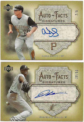 First, I got the last two cards for my 2006 Upper Deck Auto-Facts Signatures set in the mail today. Chris Duffy #2/5 and Dontrelle Willis #28/50.